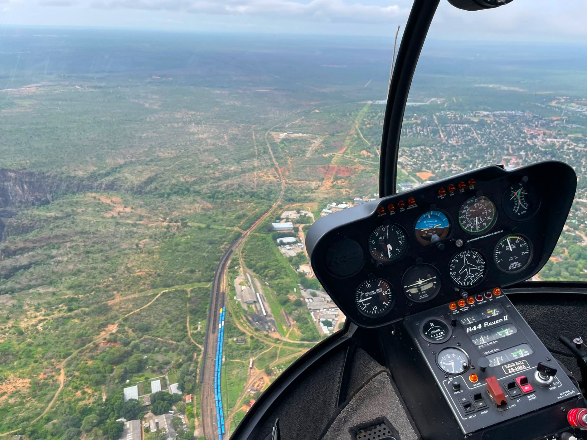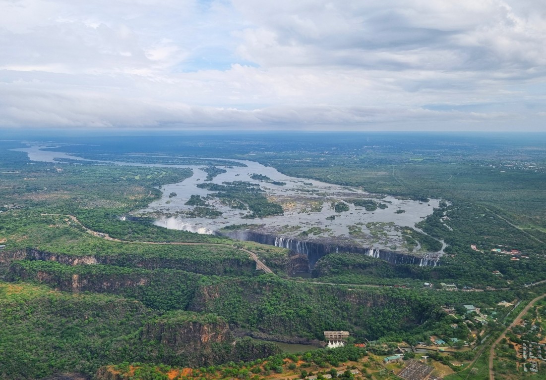 Sedan var det dags att gå ut till helikoptern, och ta plats. Vi satte på hörlurar, vår pilot presenterade sig och drog lite instruktioner, och så var vi iväg! Färden gick över staden, och det var intressant i sig att få en överblick över den. Sedan cirklade vi sakta två varv över de imponerande fallen och synen tog andan ur mig, även om regnperioden nyss startat och vattenmängden inte var på topp ännu för säsongen. Den breda Zambezifloden dyker ner i en ravin, och försvinner vidare i ett antal raviner i sicksack. På ena sidan Zimbabwe, på andra sidan Zambia. Vår tur var bara cirka 15 minuter, men kändes längre och tillräckligt. När vi kom tillbaka till helikopterstationen och klev ur var vi upprymda!