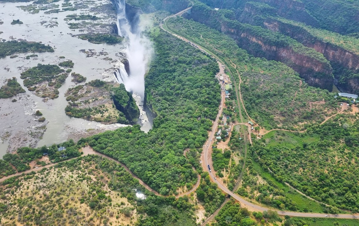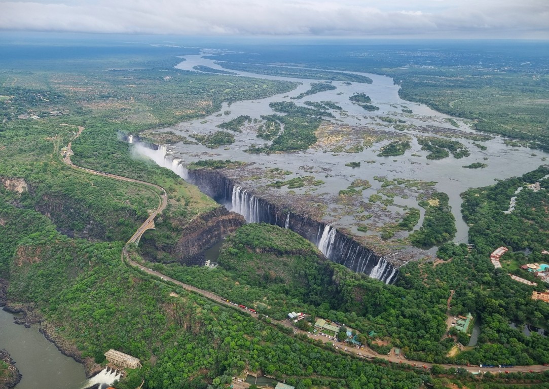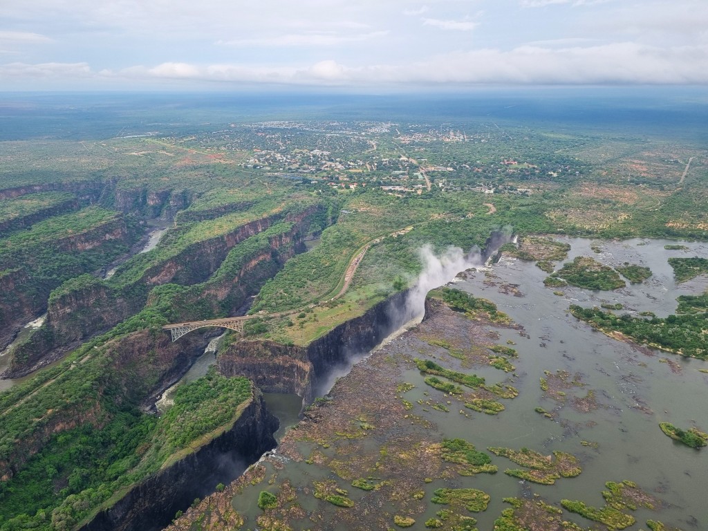 Vi hade faktiskt befunnit oss i staden Victoria Falls i två hela dagar utan att se fallen, bara ana dem genom en stigande vattendimma bakom träden, och ett vagt dånande ljud. Men nu var det dags: vi var laddade för en Fallens Dag! På vårt boende hjälpte de oss att boka en helikoptertur morgonen därpå.