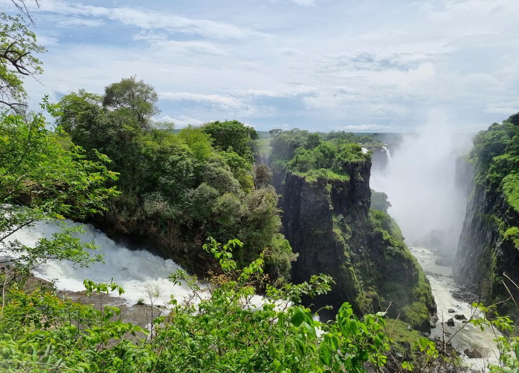 I parkens västra hörn står David Livingstone staty, och vattnet pressas samman i fallet Devil’s Cataract och får extra kraft. Här har man också en bra sikt över fallen på längden, in i ravinen.